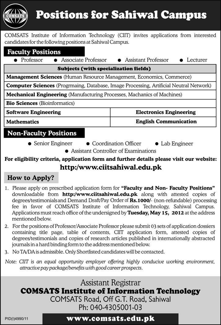 COMSATS Institute of Information Technology (CuT) invites applications from interested candidates for the following positions at Sahiwal Campus. • Associate Professor • Assistant Professor Subjects (with specialization fields) • Lecturer Management Sciences (Human Resource Management, Economics. Commerce) Computer Sciences (Progrmaing, Database, Image Processing, Artificial Neutral Network) Mechanical Engineering (Manufacturing Processes, Machanics of Machines) Bio Sciences (Bioinformatics) Software Engineering Mathematics Electronics Engineering English Communication Non-Faculty Positions • Senior Engineer . Coordination Officer . Lab Engineer . Assistant Controller of Examinations For eligibility criteria, application form and further details please visit our website: http:/www.ciitsahiwal.edu.pk How to Apply? 1. Please apply on prescribed application form for “Faculty and Non- Faculty Positions” downloadable from http/wwciitsahiwaLedu.pk along with attested copies of degree’testimonialsand Demand Draft/Pay Order of Rs.1000/- (non-refundable) processing fee in favor of COMSATS Institute of Information Technology, Sahiwal Campus. Applications must reach office of the undersigned by Tuesday, May 15, 2012 at the address mentioned below. 2. For the positions of Professor/Associate Professor please submit 03 sets of application dossiers containing title page, table of contents, CuT application form, attested copies of degrees/testimonials and copies of research articles published in internationally abstracted journals in a hard binding form to the address mentioned below. 3. No TNDA is admissible. Only Shortlisted candidates will be contacted. Note: CuT is an equal opportunity employer offering highly conducive working environment, attractive pay package/benefits with good career prospects. Assistant Registrar COMSATS Institute of Information Technology COMSATS Road, Off G.T. Road, SahwaI Ph: 040-4305001-03 Faculty_Positions • Professor