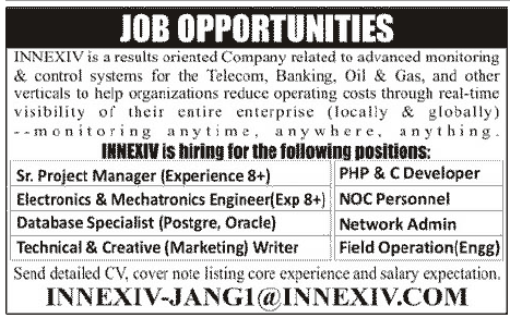 JOB OPPORTUNITIES INNFXLV jS a results orictcd Company relaled to advanced inonìtorin & control systcm for the Telecom. Banking. Oil & Gas, and other verticals to help organizations reduce operating cost5 through real-time visibility of Lheir entire enterplise (locaNy & globally) --monitoring anytme, anywhere. anything. INNEIIV is hiriug lar the IoIlowiiig IIOSÌI!ODS: Sr. Project Manager (Experience 8+) PHP & C Developer Electronics & Mechatronics Engineer(Exp 8+) NOC Personnel Database Specialist (Postgre, Oracle) Network Adrnin Technical & Creative (Marketing) Writer Field Operatìon(Engg) Send &tailed CV cover noie listing core experience and salary expectation. innexiv-jang1@innexiv.com