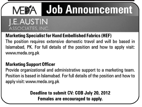 Marketing Specialistfor Hand Embellished Fabrics (NEF) The position requires extensive domestic travel and will be based in Islamabad, PK. For full details of the position and how to apply visit: www.meda.org.pk Marketing Support Officer Provide organizational and administrative support to a marketing team. Position is based in Islarriabad. For full details of the position and how to apply visit: www.meda.org.pk Deadline to submit CV: COB July 20, 2012 Females are encouraged to apply.