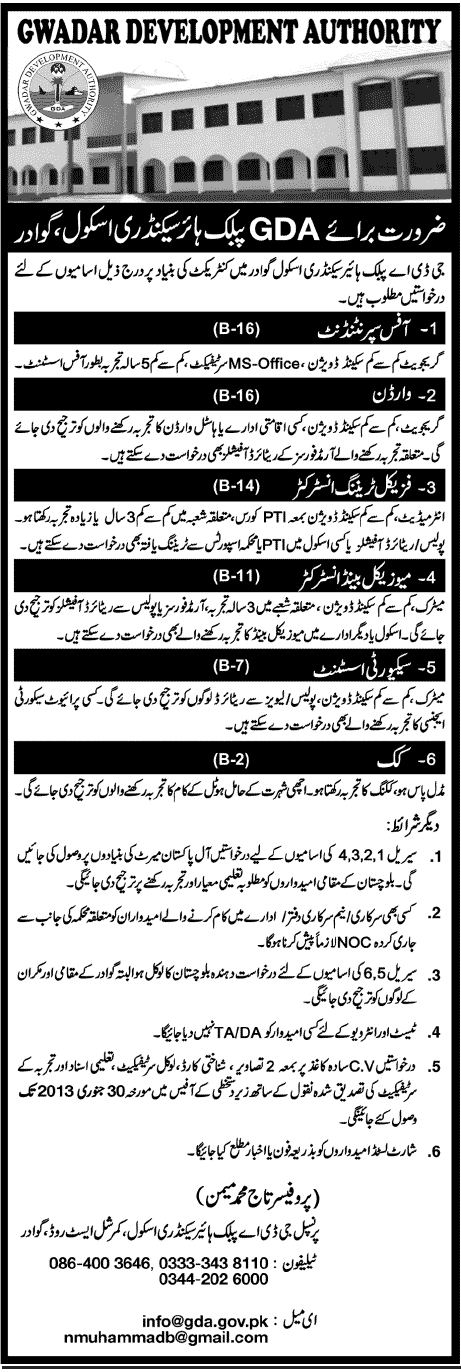 GDA Public Higher Secondary School Gwadar Jobs 2013