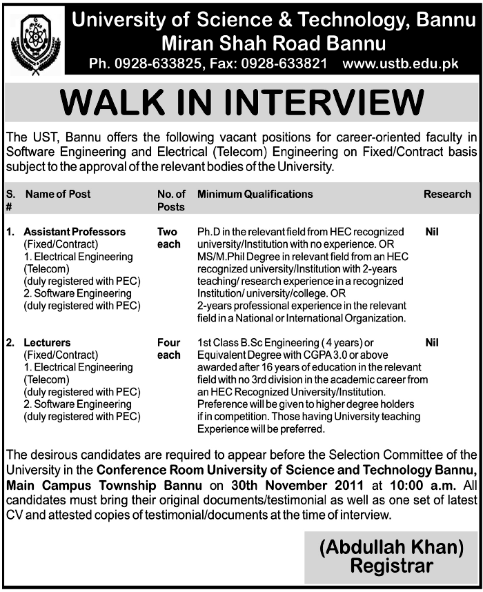 The UST, Bannu offers the following vacant positions for career-oriented faculty in Software Engineering and Electrical (Telecom) Engineering on Fixed/Contract basis subject to the approval of the relevant bodies of the University. Name of Post No. of Minimum Qualifications Research Posts Assistant Professors Two Ph.D in the relevant field from HEC recognized Nil (Fixed/Contract) each university/Institution with no experience. OR 1. Electrical Engineering MS/M.PhiI Degree in relevant field from an HEC (Telecom) recognized university/Institution with 2-years (duly registered with PEG) teaching! research experience in a recognized 2. Software Engineering Institution! university/college. OR (duly registered with PEC) 2-years professional experience in the relevant field in a National or International Organization. Lecturers Four 1st Class B.Sc Engineering (4 years) or Nil (Fixed/Contract) each Equivalent Degree with CGPA 3.0 or above 1. Electrical Engineering awarded after 16 years of education in the relevant (Telecom) field with no 3rd division in the academic career from (duly registered with PEG) an HEC Recognized University/Institution. 2. Software Engineering Preference will be given to higher degree holders (duly registered with PEG) if in competition. Those having University teaching Experience will be preferred. The desirous candidates are required to appear before the Selection Committee of the University in the Conference Room University of Science and Technology Bannu, Main Campus Township Bannu on 30th November 2011 at 10:00 a.m. All candidates must bring their original documents/testimonial as well as one set of latest