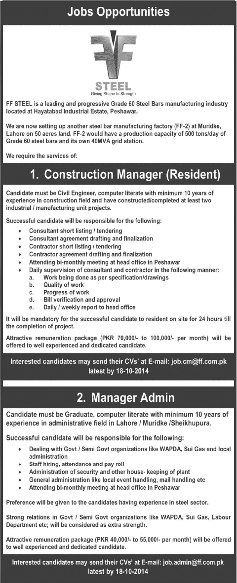 - FF Steel Muridke Jobs 2014 October for Civil Engineer & Admin Manager