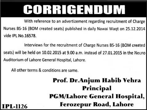 - Corrigendum: Lahore General Hospital Jobs 2015 Charge Nurses Test / Interview Schedule