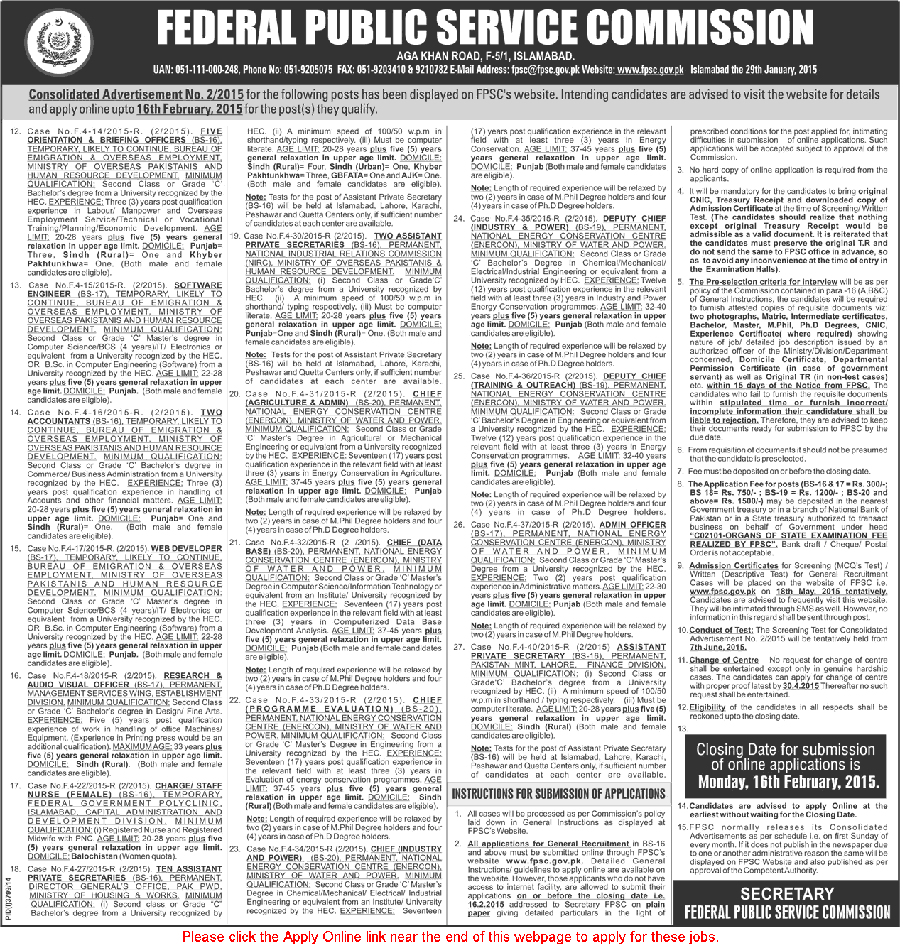 - FPSC Jobs February 2015 Apply Online for Consolidated Advertisement No 2/2015
