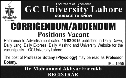 - Corrigendum: GC University Lahore Jobs 2015 February Professor Botany