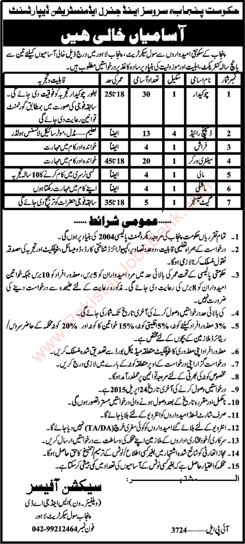 - Services and General Administration Department Punjab Jobs 2015 April Chowkidar, Dispatch Rider & Others S&GAD Lahore