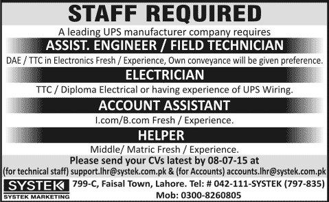 - Systek Pvt. Ltd Jobs 2015 June / July DAE Electrical / Electronics Engineer, Accounts Assistant & Helper