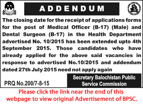 - BPSC Medical Officer Jobs 2015 Balochistan Public Service Commission Closing Date Extension Addendum