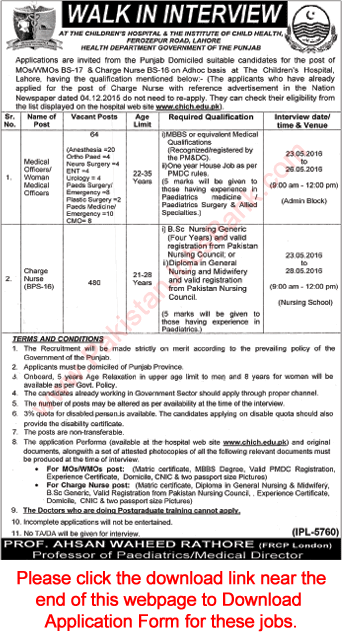 - Children's Hospital Lahore Jobs May 2016 Application Form Charge Nurses and Medical Officers (MO & WMO)