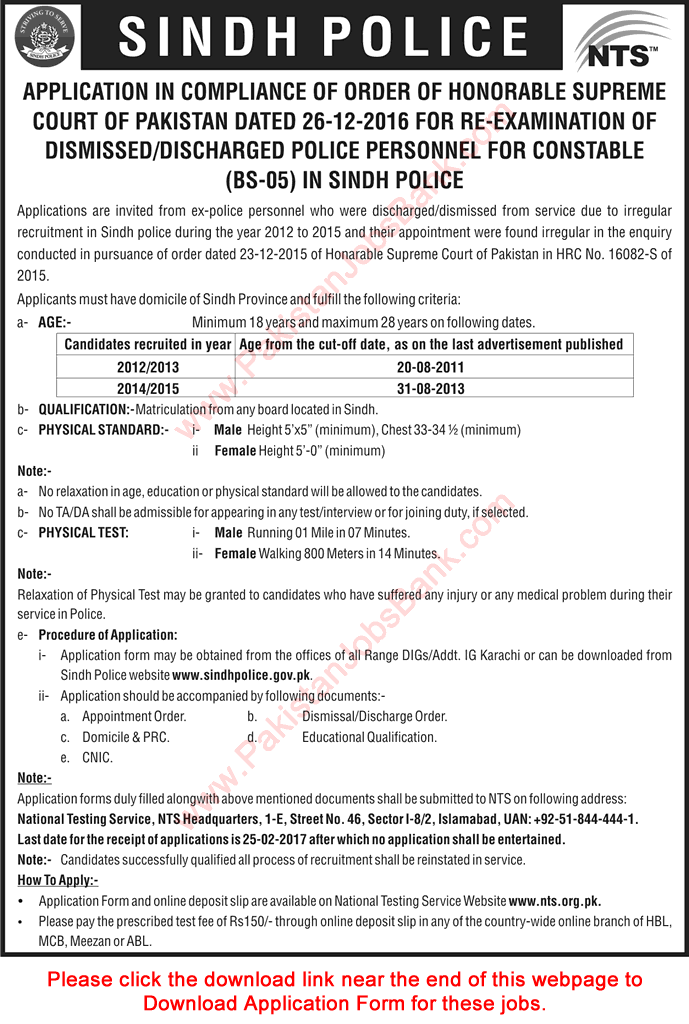 - Sindh Police Constable Jobs 2017 February NTS Application Form Re-Examination of Dismissed/Discharged Police Personnel