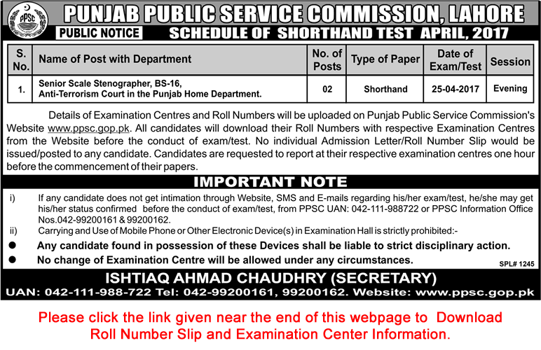 - PPSC Shorthand Test Schedule April 2017 Stenographer Roll Number Slip Download