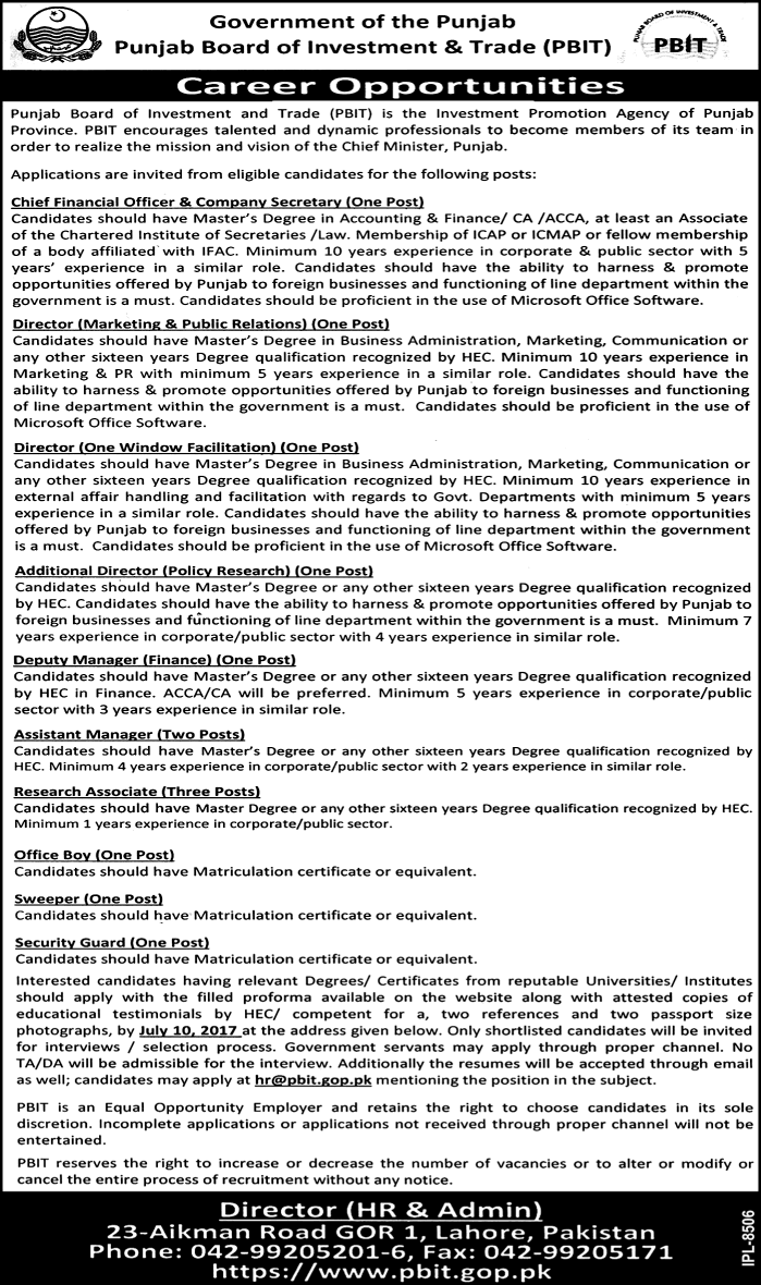 - Punjab Board of Investment and Trade Lahore Jobs 2017 June PBIT Research Associate & Others