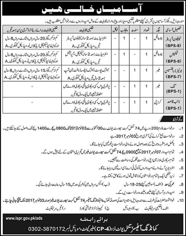 74 Signal Combat Support Unit Malir Karachi Jobs 2017 October / November Pakistan Army Latest