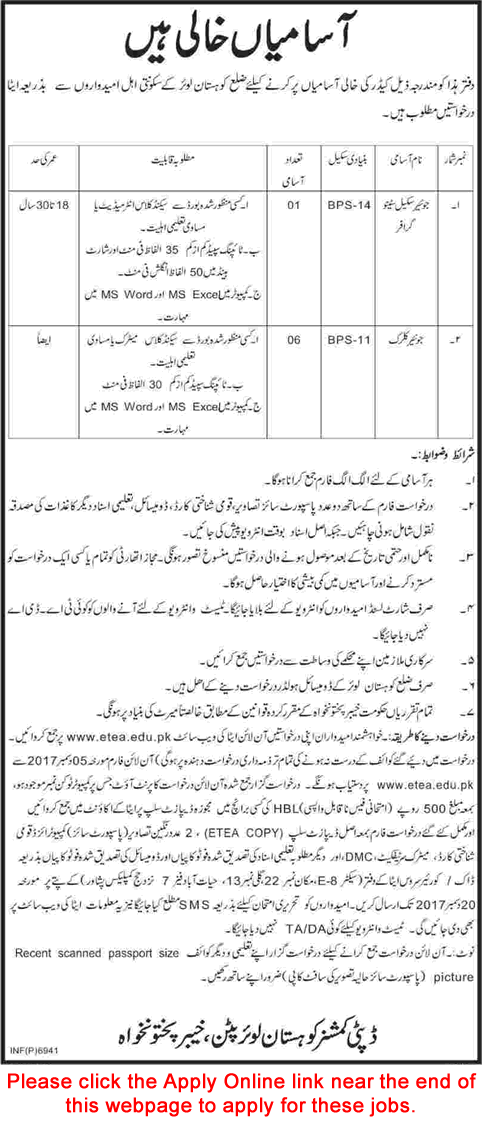 - Deputy Commissioner Office Kohistan Jobs 2017 December ETEA Apply Online Clerks & Stenographer