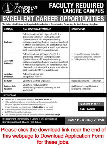 Please visit the following link to Online Download Application Form for University of Lahore (UOL) Jobs July / August 2018: