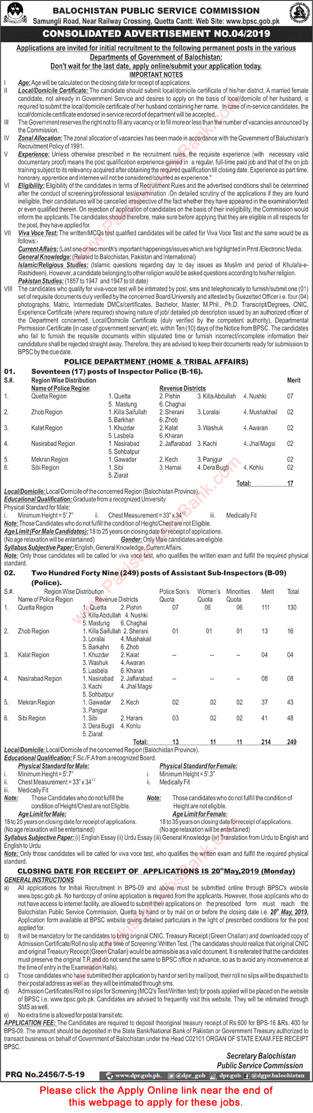 - Balochistan Police Jobs May 2019 Assistant Sub Inspectors ASI & Inspectors BPSC Apply Online