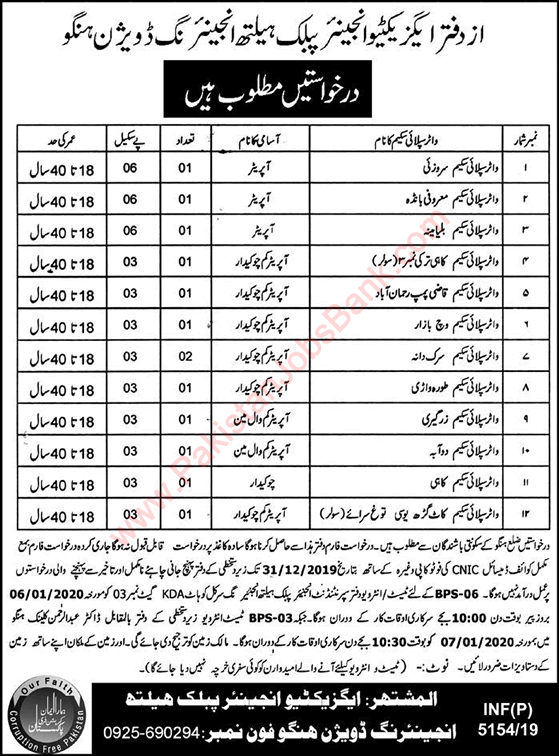 - Public Health Engineering Division Hangu Jobs 2019 December KPK Operators, Chowkidar & Valveman