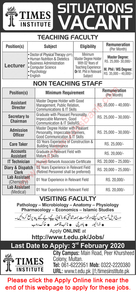 - Teaching Faculty Jobs in Times Institute Multan 2020 January