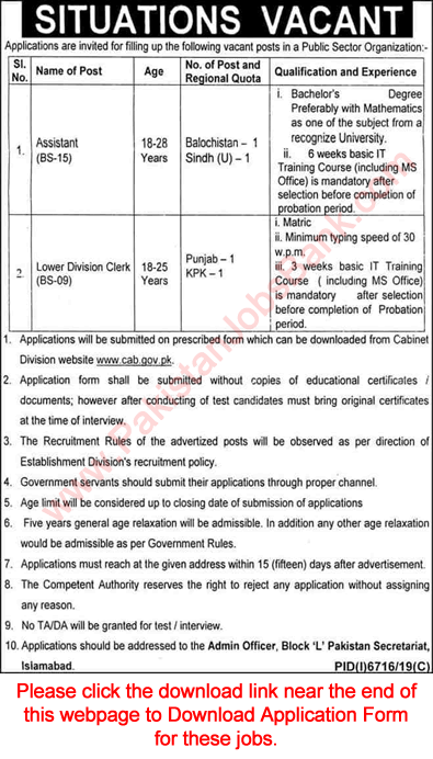 - Cabinet Division Islamabad Jobs June 2020 Application Form Clerk & Assistant