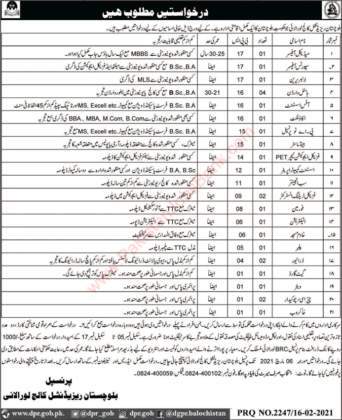 - Balochistan Residential College Loralai Jobs 2021 February Hostel Warden & Others