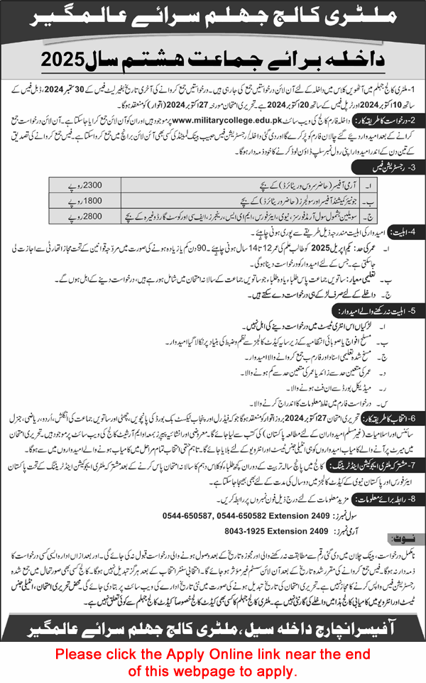 - Military College Jhelum Admission in 8th Class 2024-2025 Online Application / Admission Form