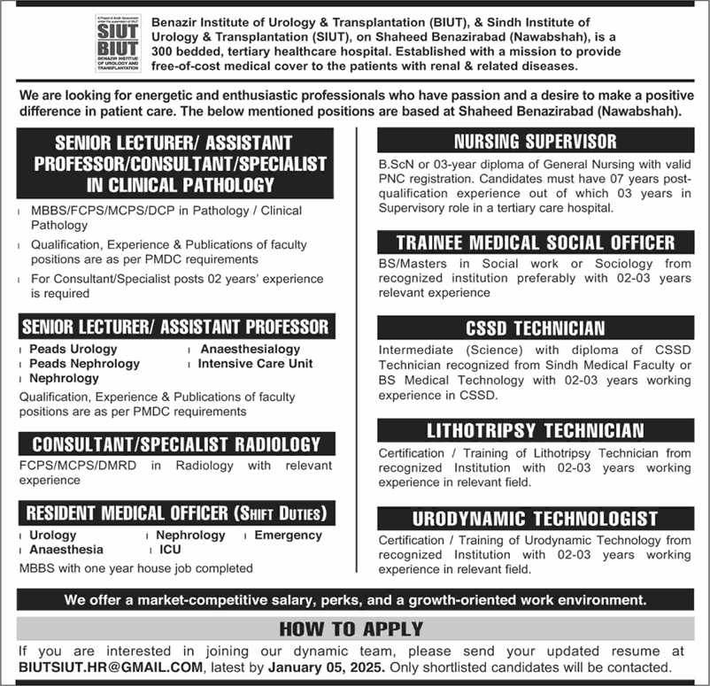 - BIUT / SIUT Hospital Nawabshah Jobs December 2024 / 2025 Sindh
