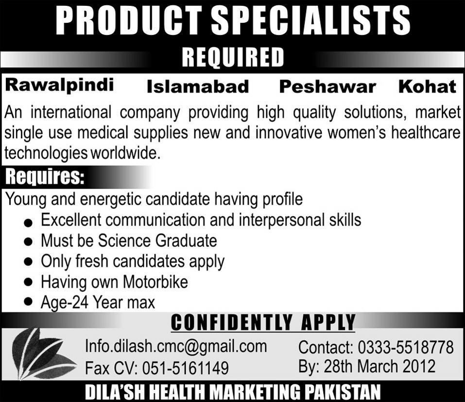 RawalpindiPeshawar Kohat I i international company providing high quality solutions, market single use medical supplies new and innovative women’s healthcare technologies worldwide. Requires: Young and energetic candidate having profile . Excellent communication and interpersonal skills . Must be Science Graduate . Only fresh candidates apply . Having own Motorbike . Age-24 Year max CONFIDENTLY APPLY Info.dilash.cmcgmaiI.com Contact: 0333-5518778 Fax CV: 051-5161149 By: 28th March 2012 DILASH HEALTH MARKETING PAKISTAN PRODUCT SPECIALISTS A Islamabad