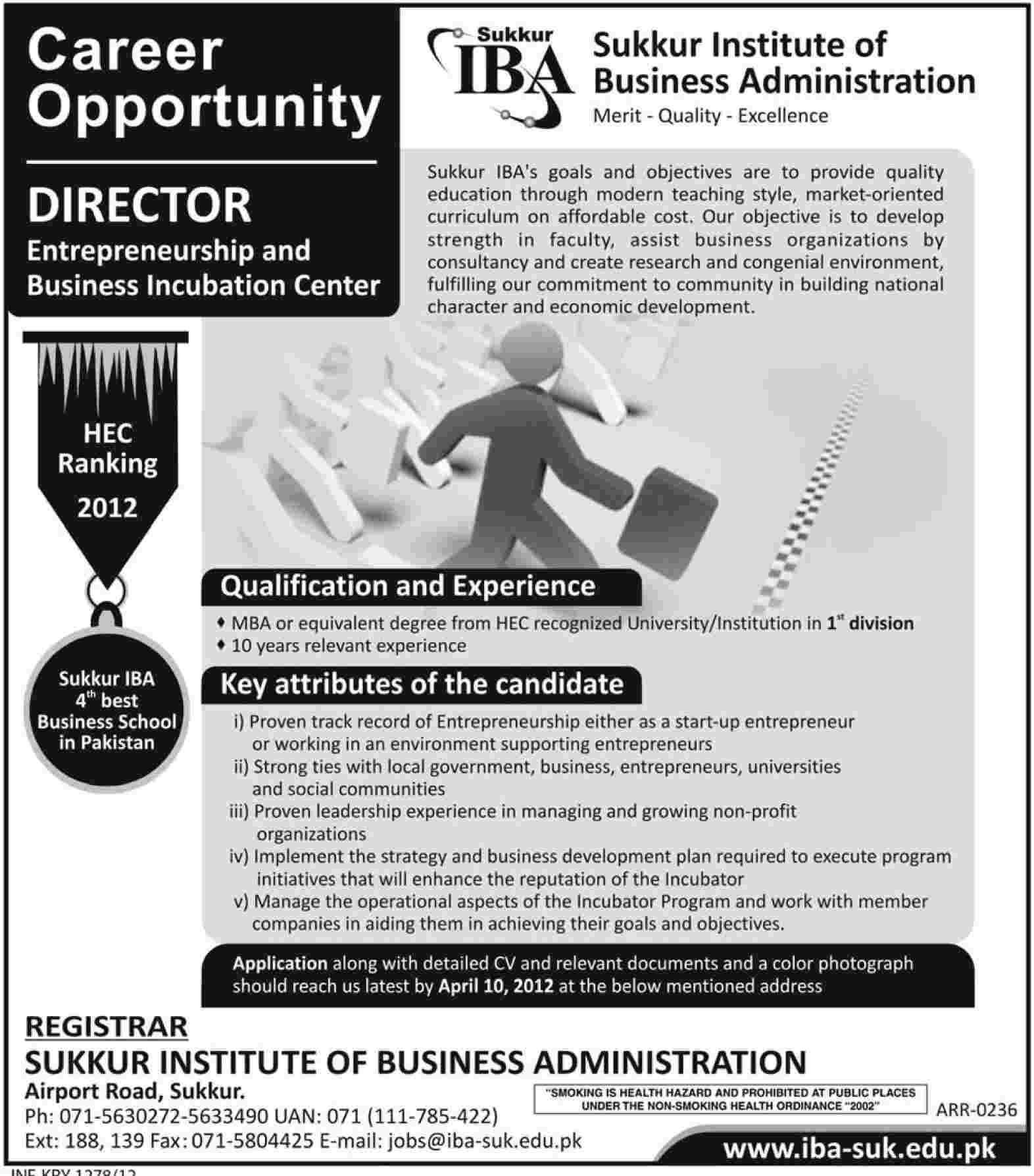 Sukkur Sukkur Institute of Business Administration Merit - Quality - Excellence REGISTRAR Sukkur IBA’s goals and objectives are to provide quality education through modern teaching style, market-oriented curriculum on affordable cost. Our objective is to develop strength in faculty, assist business organizations by consultancy and create research and congenial environment, fulfilling our commitment to community in building national character and economic development. • MBA or equivalent degree from HEC recognized University/Institution in 1 division. • 10 years relevant experience. t Key attributes of the candidate i) Proven track record of Entrepreneurship either as a start-up entrepreneur or working in an environment supporting entrepreneurs. ii) Strong ties with local government, business, entrepreneurs, universities and social communities. iii) Proven leadership experience ¡n managing and growing non-profit organizations. iv) Implement the strategy and business development plan required to execute program initiatives that will enhance the reputation of the incubator. y) Manage the operational aspects of the incubator program and work with member companies in aiding them in achieving their goals and objectives. Application along with detailed CV and relevant documents and a color photograph should reach us latest by April 10, 2012 at the below mentioned address SUKKUR INSTITUTE OF BUSINESS ADMINISTRATION Airport Road, Sukkur Ph: 07 1-5630272-5633490 UAN: 071 (11 1-785-422) Ext: 188, 139 Fax: 07 1-5804425 E-mail: jobs@iba-suk.edu.pk ¡ Sukkur IBA 41k best Business School in Pakistan r ARR-Ü2.b